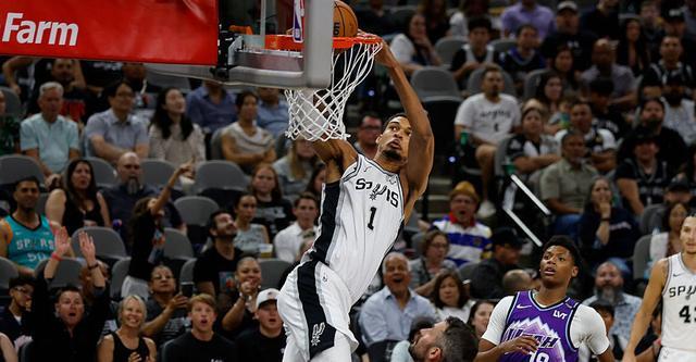 马刺队文班10投6中22分7板3助攻,大卫-琼斯-加西亚20分,瓦塞尔18分,乌穆德13分,凯尔登11分,尚帕涅10分,哈珀6投4中9分3助攻0失误;